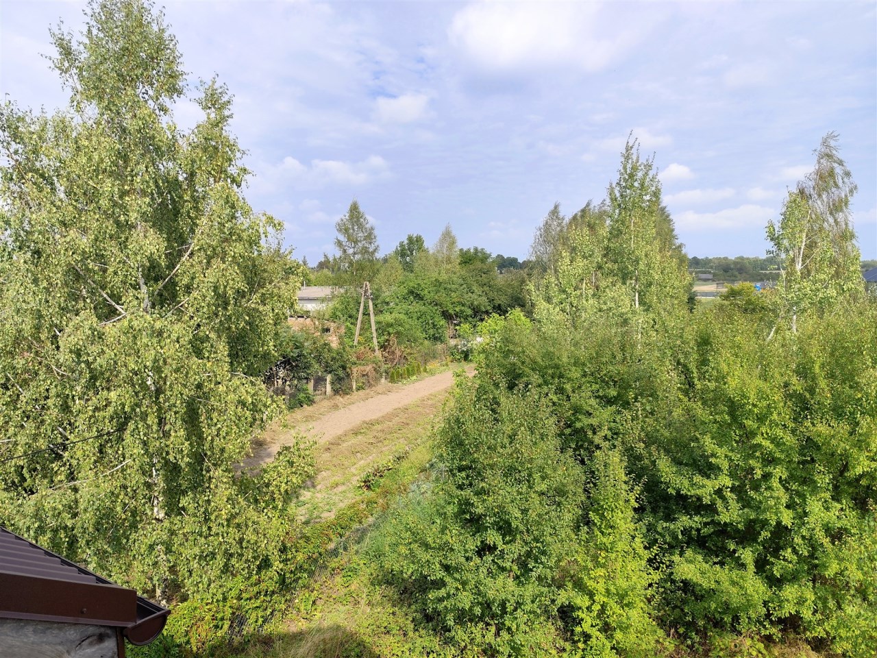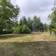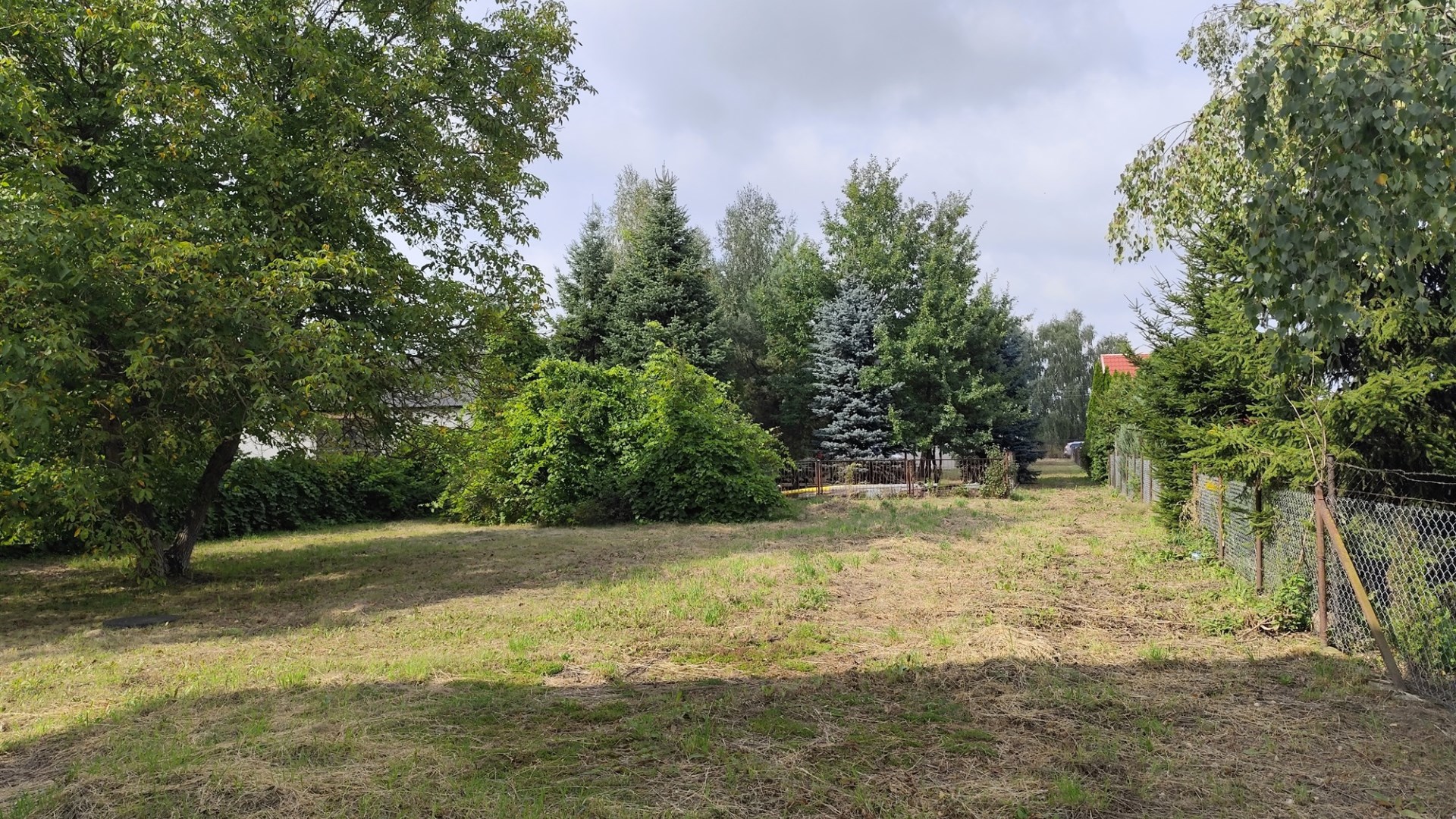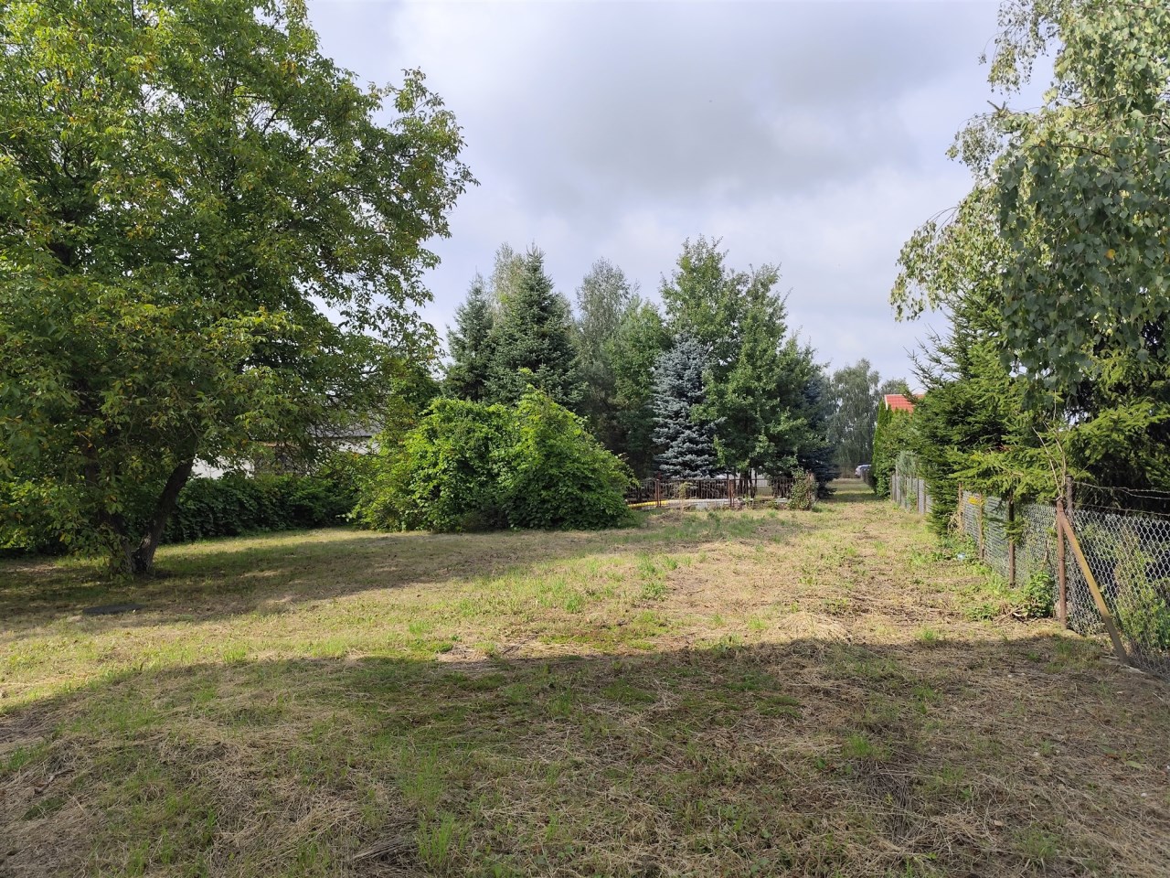 Działka: 1179 m2 duża, kształtna, ogrodzona płotem stalowym z siatką na podmurówce betonowej. Rosną na niej duży orzech włoski inne drzewka, oraz trawa.